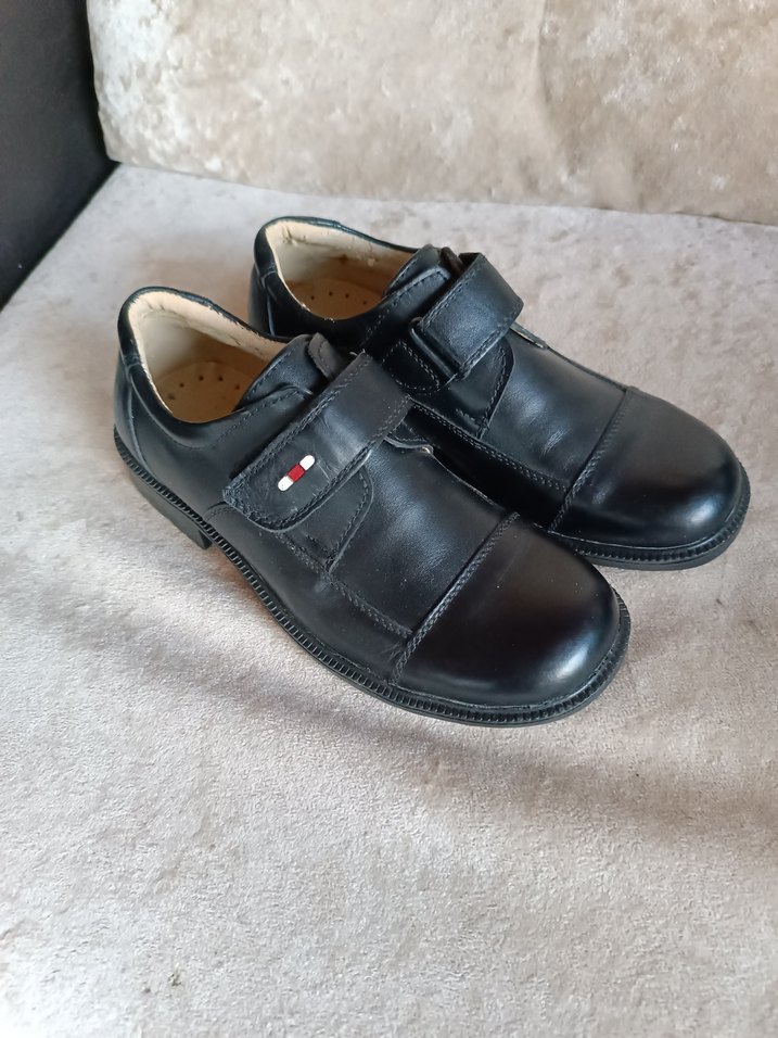 Siyah erkek çocuk ayakkabısi desen içermeyen yüzeyiyle trend ve sokak stiline uygundur. 33 numarası (az giyildi) ayakkabınin arka iç kısmında hafif deri döküntüsü oluşmuş ama yeni gibi kullanışlı