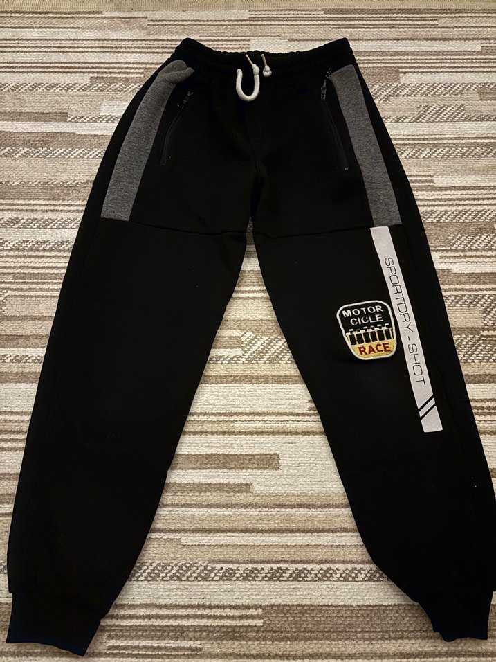 Siyah renkli, baskılı detaylı ve tokalı erkek çocuk eşofman altı. Yumuşak kumaştan, fermuarlı cepli ve rahat kesimle günlük kullanıma uygun.