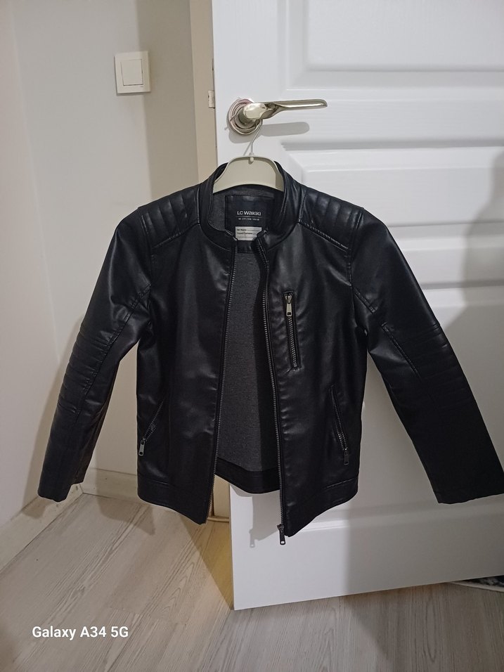 10-11 yaş .Siyah, deri malzemeden yapılmış, kesimli ve tokalı erkek çocuk biker ceketi. Yaka kısmı kesik ve desensiz, şık bir görünüme sahiptir. sayılı giyilmistir.küçüldüğü için satıyorum