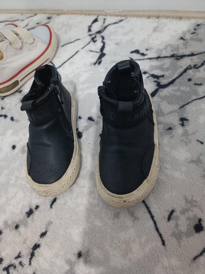 Siyah deri malzemeden yapılmış, cırt cırtlı ve fermuarlı desen içermeyen erkek çocuk botları. Gri tabanlı, sokak stili görünümüyle dikkat çeker.
