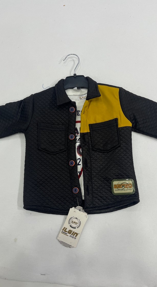Siyah erkek çocuk ceketi, düğmeli ve yakalıdır. Regular fit, baskılı desenli ve göğüs cep kısmında sarı detay bulunur. Yumuşak ve sıcak kumaştan yapılmıştır. İmalathaneden cocuk gıyım