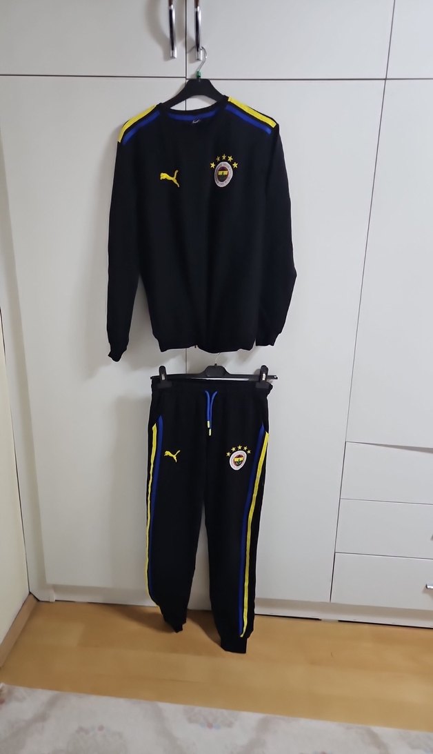 Siyah, baskılı ve kadife kumaştan erkek çocuk eşofman takımı. Üstü bisiklet yaka, cırt cırtlı detaylı, altı ise sarı ve mavi şeritli, dar kesim.