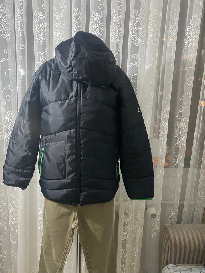 Fermuarlı, kapüşonlu siyah erkek çocuk mont, boğazlı yaka ve yumuşak sıcak kumaş ile rahat sokak stili için uygundur.