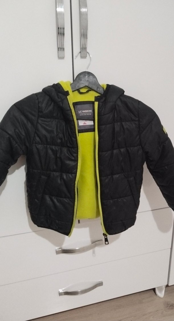 Fermuarlı, notched lapel yakalı siyah erkek çocuk street wear mont, içi yumuşak sarı fleece astarlı, dar kesim. resimleri inceleyiniz. fermuar girişinde bı hasar vardır . 6.7 fakat kalıbı dar ..4. 5 yaşındayken giydi oğlum su an 6 yaşında küçük geliyo . başka yırtık hasarı yoktur . iade kabul etmiyorum. o yüzden resimleri iyce inceleyiniz . Lcw marka