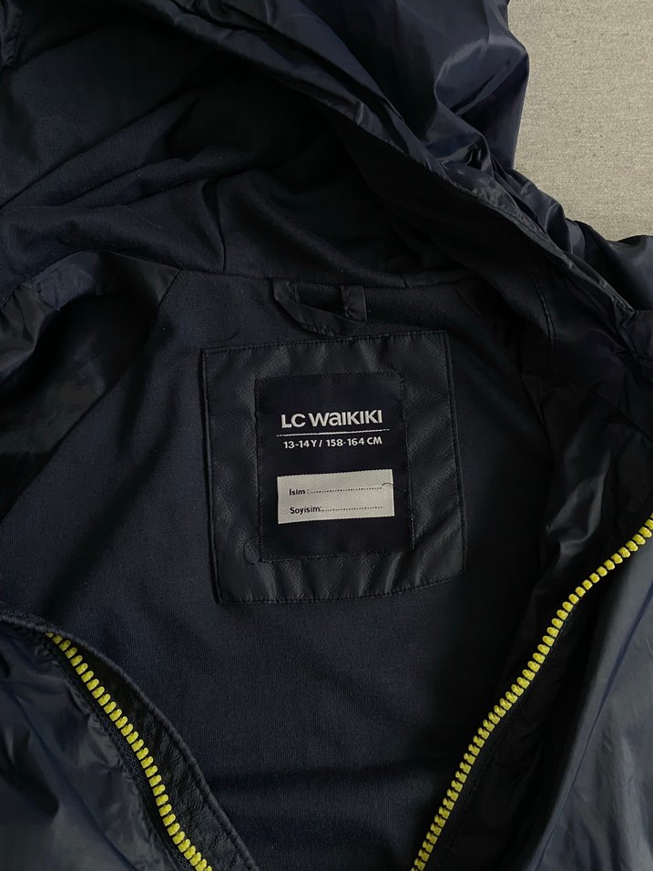 Sokak stili için sentetik kumaştan üretilmiş, fermuarlı ve kesik yakalı siyah erkek çocuk yağmurluğu. LC Waikiki markalı. ☔