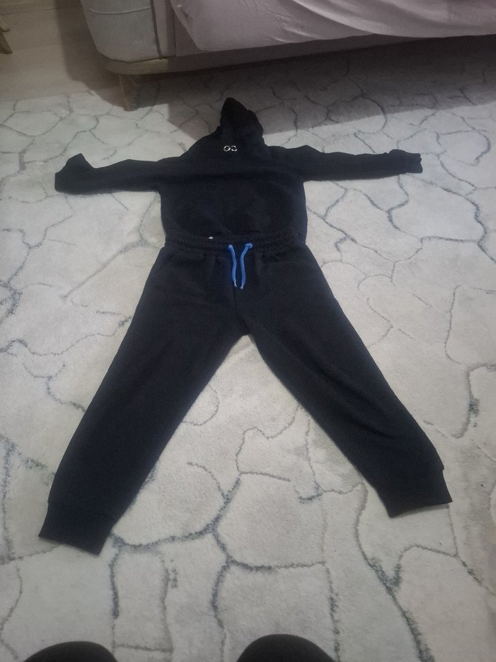 Kapişonlu siyah renkli ince kesim erkek çocuk eşofman takımı. Yumuşak ve sıcak kumaş, sade ve şık tasarım, mavi bağcıklı detay. 4-5 yaş uyumlu siyah renkte kapişonlu eşofman takımı sweat kısmının ipi eksik pantolon kısmında birkaç belli belirsiz yapışkan lekeleri var onun haricinde bir sorunu yok bu yüzden fiyatı makul tutuyorum pantolon yanlardan cepli beli ipli