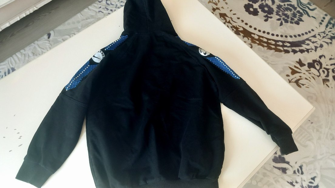 Fermuarlı ve kapüşonlu, siyah renkli erkek çocuk ceketi. Yumuşak ve sıcak kumaştan, kollarında mavi desen detaylarıyla sokak stilinde.