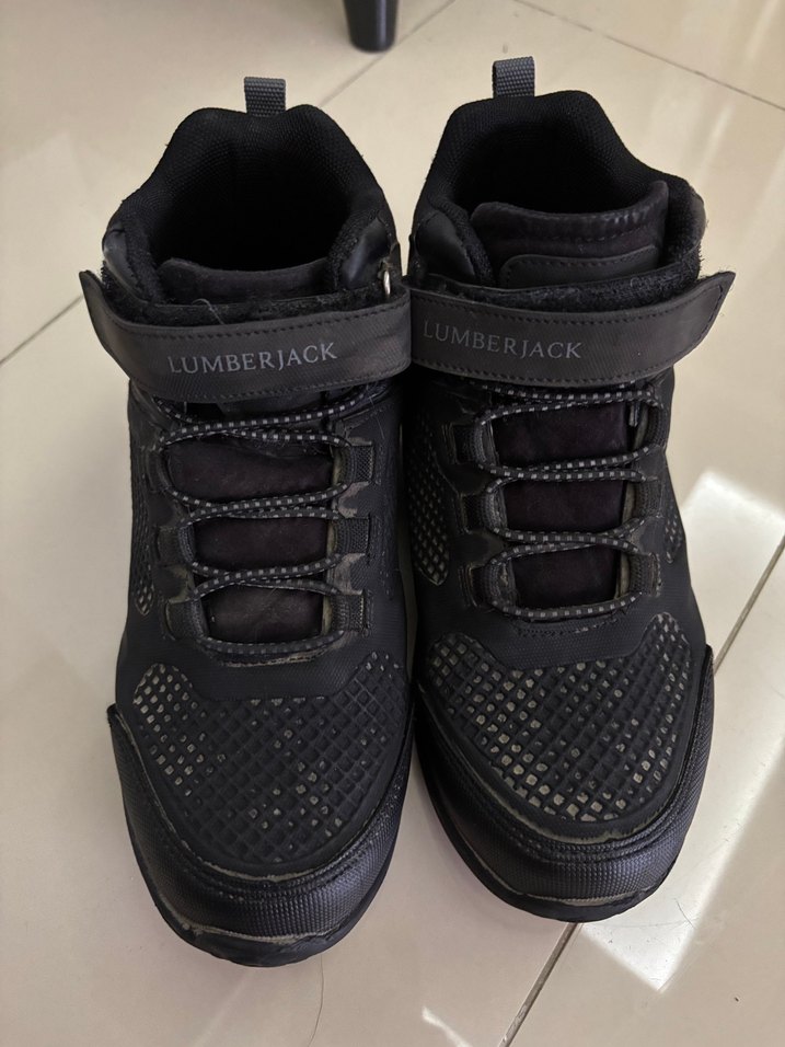Lumberjack markalı siyah kauçuk erkek çocuk botları, Velcro bantlı, desen içermeyen, sokak modası ve rock punk tarzında. Makinede yıkandı kullanıma hazırdır