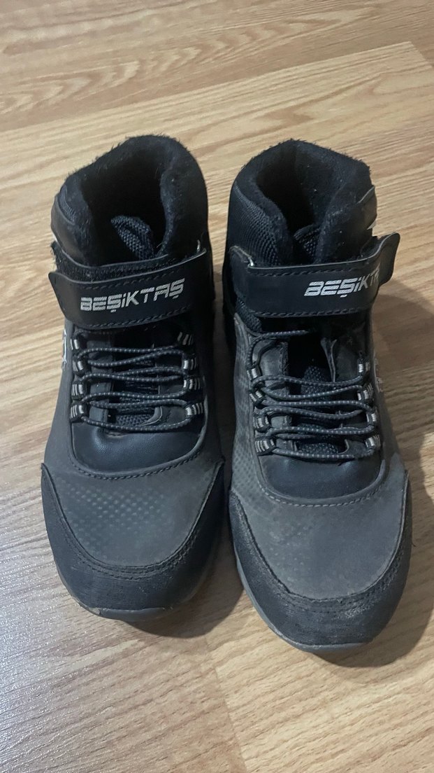 Kaydırmaz bantlı, siyah erkek çocuk botu. Kauçuk malzemeden, sokak stili ve desensiz tasarıma sahip. Üzerinde 'BESIKTFIS' yazısı bulunur.