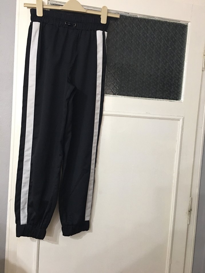 Siyah, kemerli ve yanları beyaz şeritli erkek çocuk eşofman altı, yüksek bel ve rahat kesimle sokak stiline uygun.