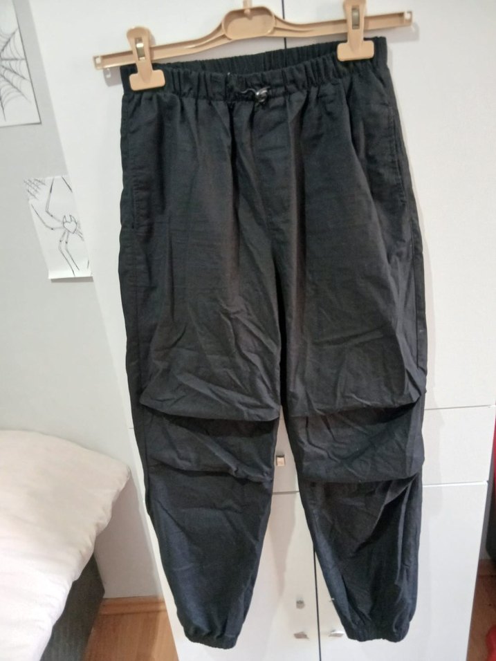 Siyah keten kumaştan, rahat kesimli ve paraşüt model Sokak stili ve athleisure rahatlığını bir arada sunar, dış mekan kullanımı için uygundur.