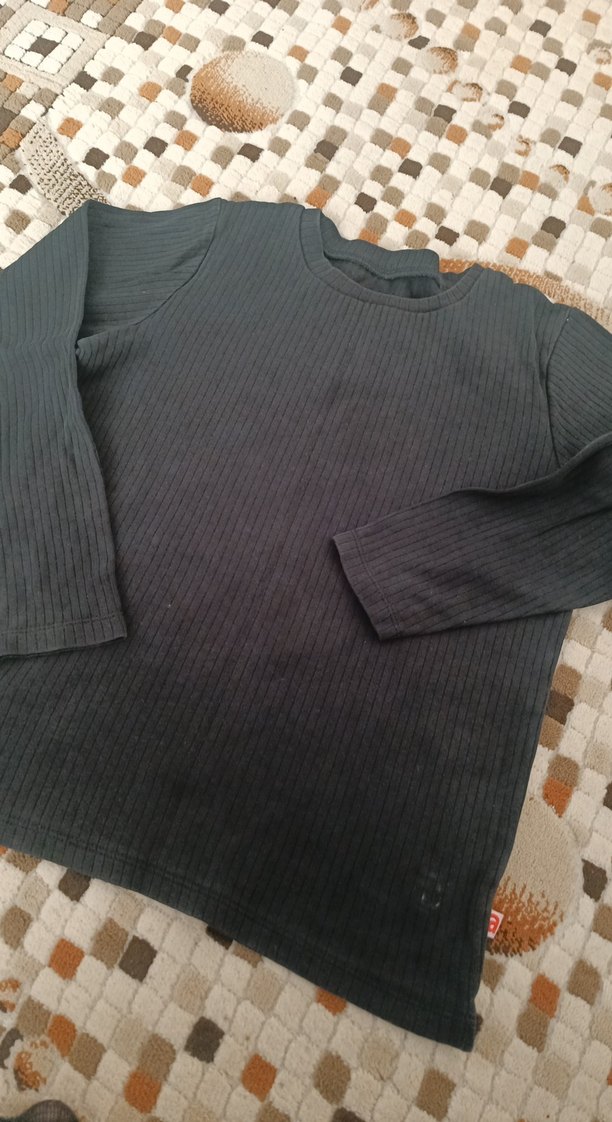 siyah renkte, keten kumaştan örülmüş, yuvarlak yaka ve uzun kollu erkek çocuk triko kazak. Rahat ve sade bir kesime sahiptir.