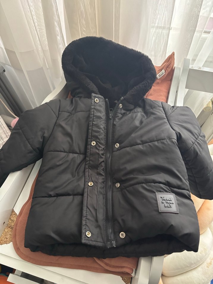 Siyah, kürklü kapüşonlu, notched lapel yakalı, dar kesim erkek çocuk montu Hiçbir deformesi yoktur 9/12/18 ay uyumludur İçi kürklü sıcak tutar
