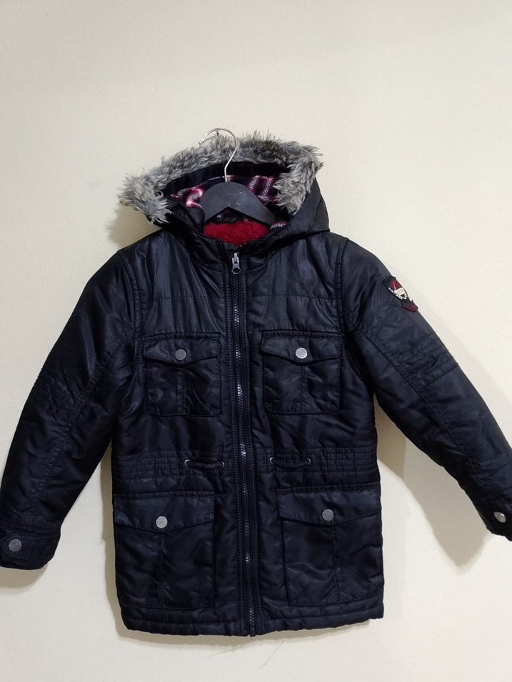 Siyah, kürklü kapüşonlu ve içi yumuşak kumaşlı, notched lapel tarzında, bağlama desenli erkek çocuk montu.