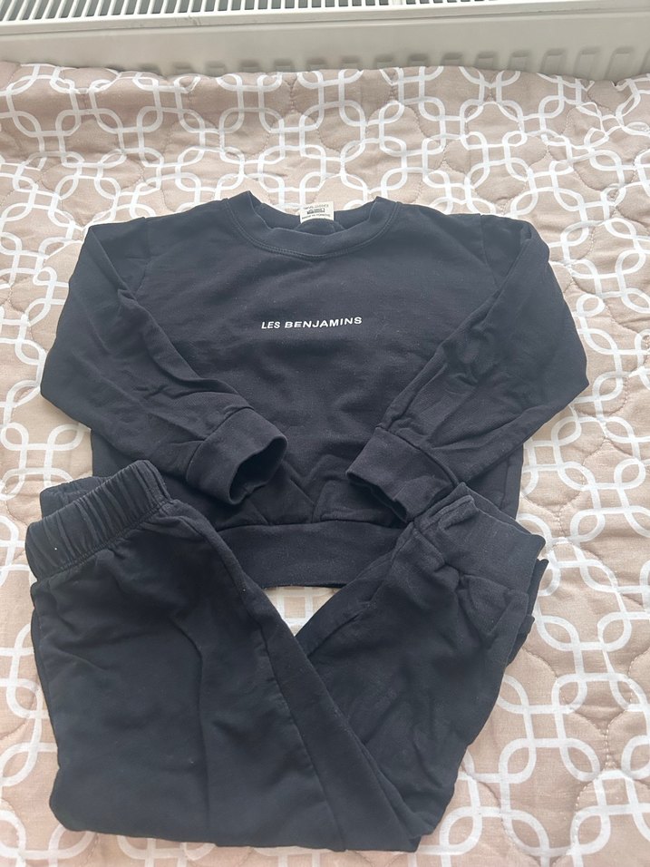 Siyah renkli, oversize kesime sahip erkek çocuk eşofman takımı. Crew neck sweatshirt ve rahat pantolon, yumuşak keten kumaştan üretilmiştir. 'LES BENJAMINS' logosu bulunmaktadır.