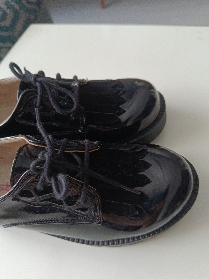 Siyah parlak kauçuk özel gün ayakkabısı, fırfır detaylı ve gotik tarzda, modaya uygun bir görünüm sağlar.