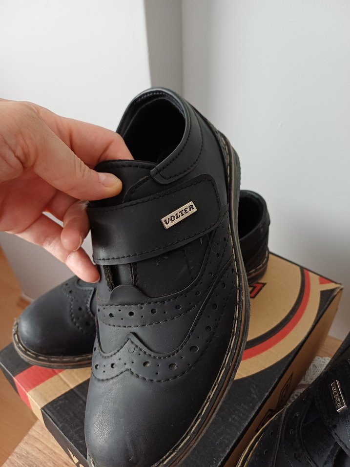 Siyah, baskılı detaylı, Velcro bantlı erkek çocuk özel gün ayakkabısı. Kauçuk tabanlı, punk rock ve karşı kültür tarzı. Marka:volter 35 numara