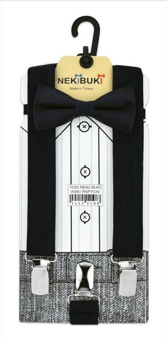 Yumuşak ve sıcak kumaştan yapılmış siyah papyon ve askı seti, modern klasik tarzda baskılı detaylarla. Türkiye'de üretilmiştir.