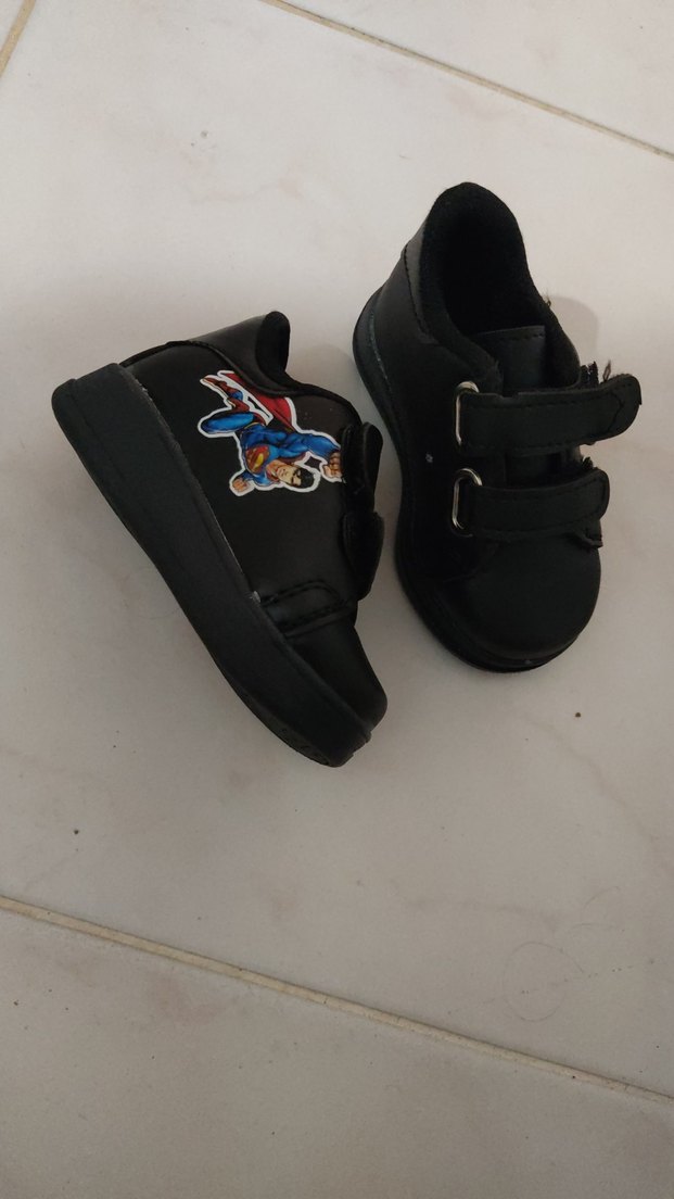 Siyah erkek çocuk sneakers, lastik tabanlı ve renkli süper kahraman baskılı. Kolay kullanım için cırt cırtlı bantlara sahip, rock punk tarzında sokak giyimine uygun. hiç kullanılmadı