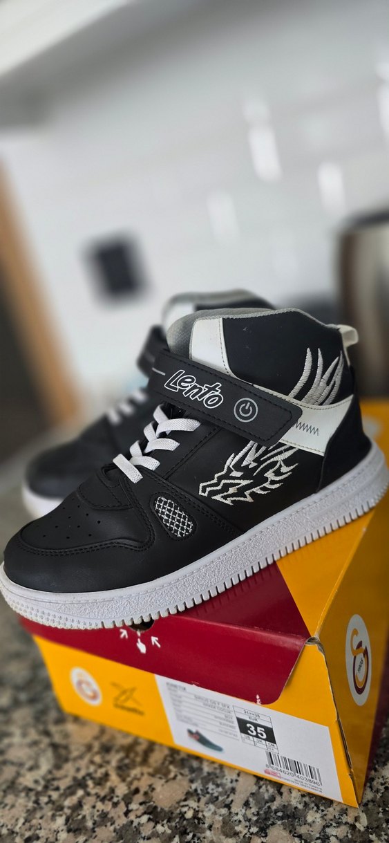 Sadece 2 defa giyildi sıfır ayakkabıdır. bantlı, baskılı desene sahip siyah erkek çocuk spor ayakkabısı. Dayanıklı kauçuk tabanlı, trendy rahat sokak stili için uygun. 'Lento' logosu bulunur.