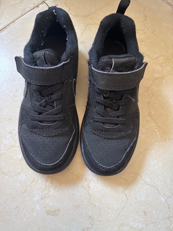 Velcro bantlı, kauçuk tabanlı, siyah renkte sade erkek çocuk spor ayakkabısı. Rahat ve kullanışlı.