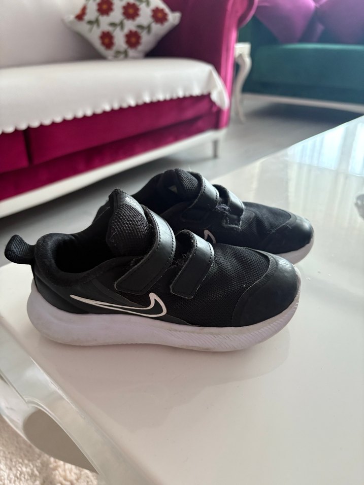 Siyah, koyu tonlu erkek çocuk spor ayakkabısı, velcro bantlı ve kauçuk tabanlıdır. Sokak stili ve trend bir günlük görünüm sunar. 3. Fotoğrafta ufak defosunu belirttim