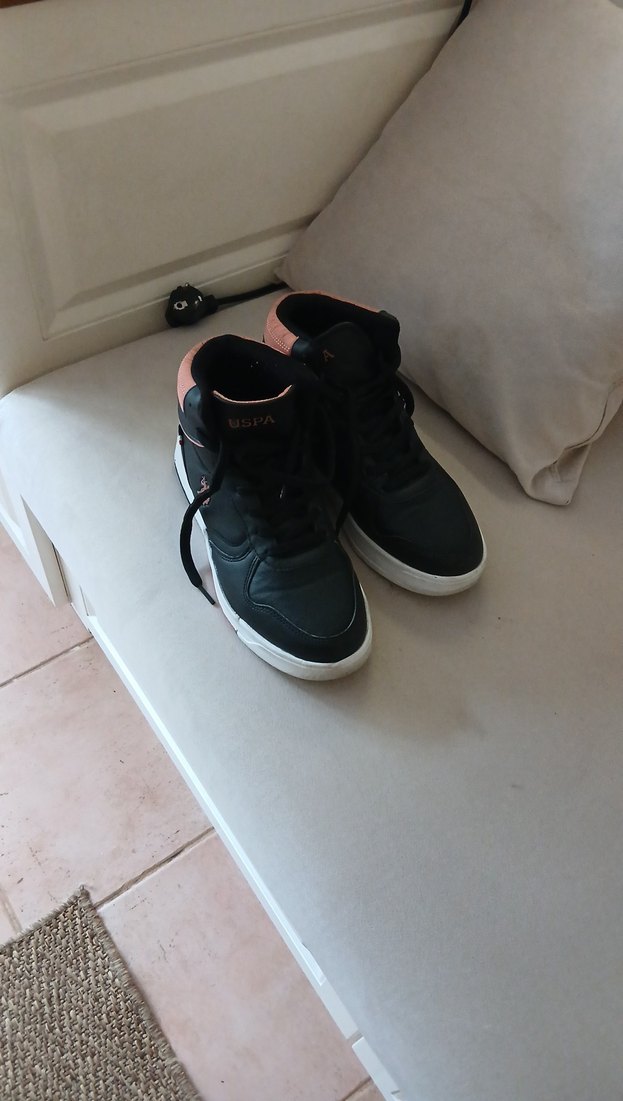 Siyah ve koyu tonlu erkek çocuk spor ayakkabısı, velcro bağlama sistemi ve kauçuk tabanlı, sade tasarımıyla sokak modasına uygun. Polo ,yeni ,1 defa giyildi