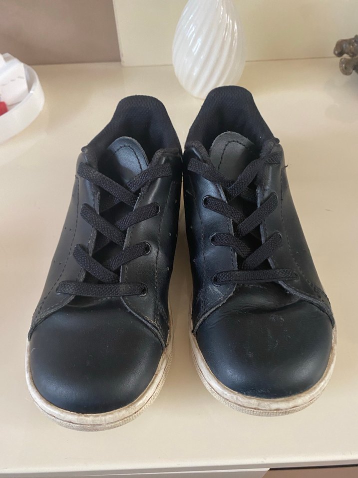 Siyah renkli, lastik tabanlı erkek çocuk spor ayakkabısı, velcro ve bağcıklı kapama özellikli, sade ve basic tarzda.orijinal adidas