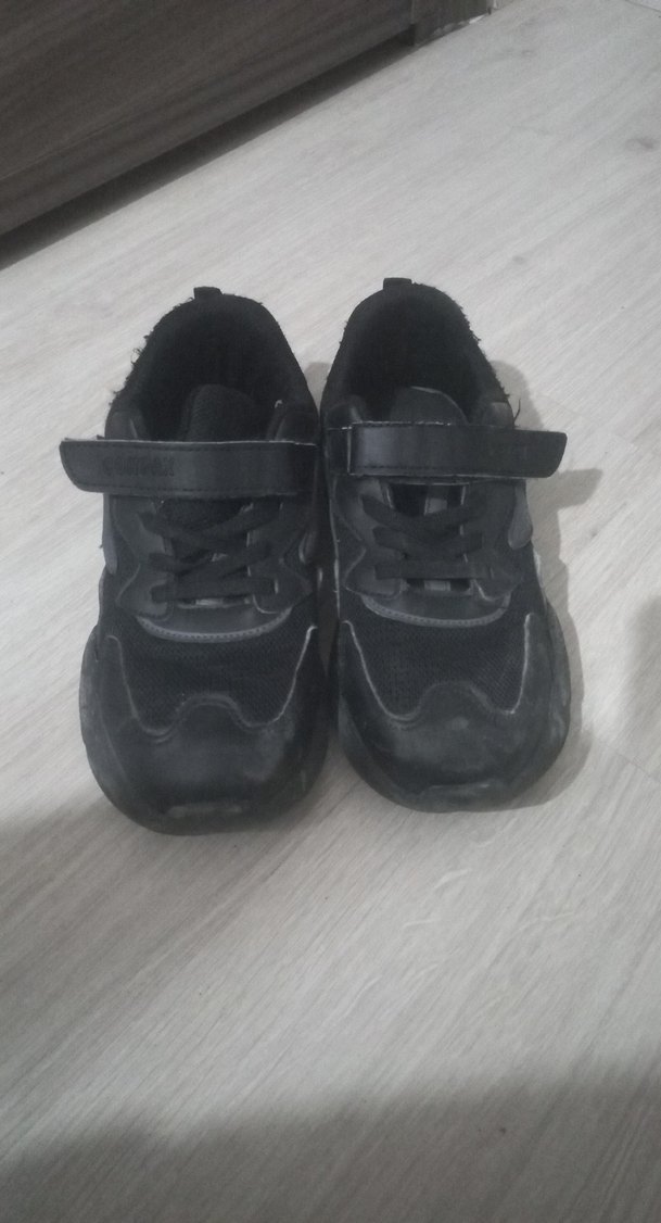 Siyah renkli, kauçuk malzemeden yapılmış, velcro bantlı erkek çocuk spor ayakkabısı. Düz, koyu renkli sokak stili. Rahat ve kullanışlı.