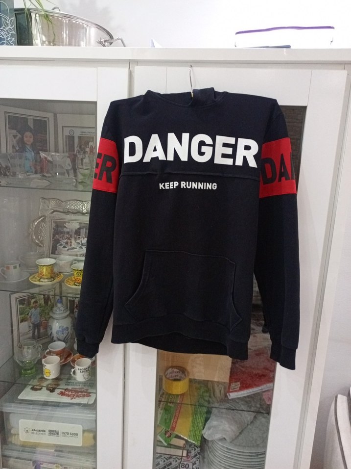 Siyah, uzun kollu, bol kesim erkek çocuk sweatshirtü. Önünde "DANGER" ve "KEEP RUNNING" baskısı bulunur. Yumuşak ve sıcak kumaştan, cırt cırt detaylı. kapşonlu kazak l beden dıo ama dar kalıp 13 15 yaş arasıda da olur s beden gıyen bırınede olur