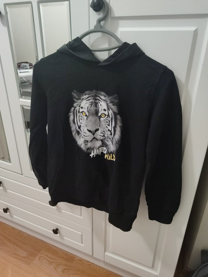 Uzun kollu, kapüşonlu siyah erkek çocuk sweatshirt, önünde kaplan baskısı ve geniş kesim bulunur.