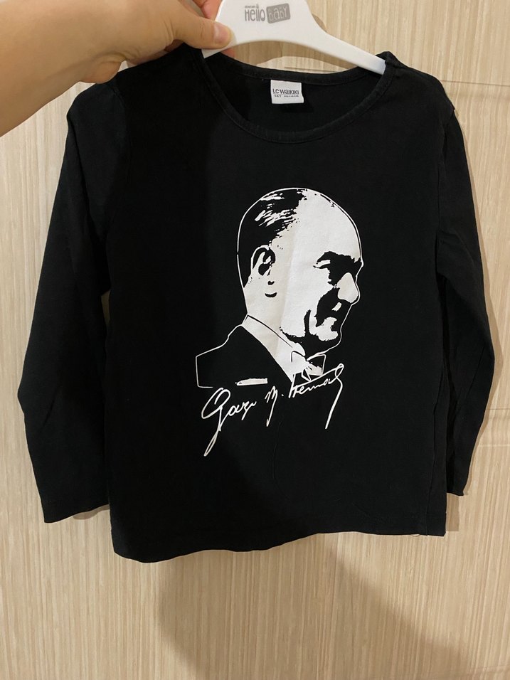Siyah renkli, pamuklu kumaştan, uzun kollu, baskılı ve geniş kesim erkek çocuk tişörtü, sokak stiline uygun. 1-2 kez giyildi. 5-6 yaş yazıyor ancak kalıp olarak dar. 3-4 yaş kullanımına daha uygun
