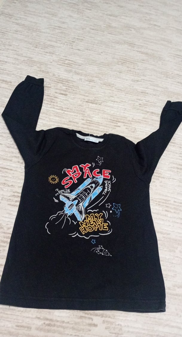 Siyah renkli, uzun kollu ve bisiklet yaka erkek çocuk sweatshirtü. Yumuşak ve sıcak kumaştan, uzay temalı baskı ve cırt cırt detaylıdır. 8-9 yaş,temiz ürün oluşuna garantim vardır