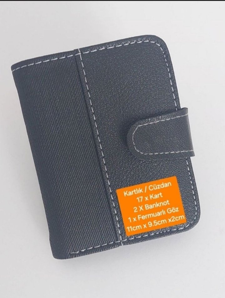 Siyah renkli, baskılı erkek cüzdanı; 17 kartlık, 2 banknot bölmesi ve 1 fermuarlı göz içerir. Ölçüleri 11x9,5x2 cm.