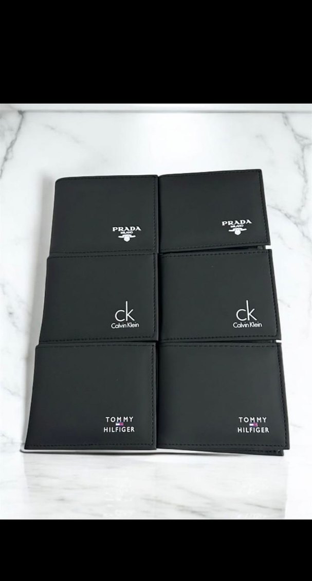 Prada, Calvin Klein ve Tommy Hilfiger marka logolu siyah erkek cüzdanları.