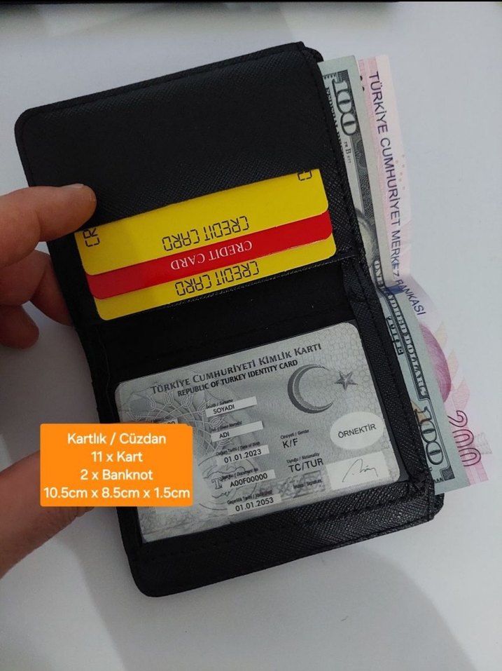 11 kartlık ve 2 banknotluk siyah erkek cüzdanı, 10.5cm x 8.5cm x 1.5cm ölçülerinde, iş hayatına uygun sade ve baskılı tasarım.
