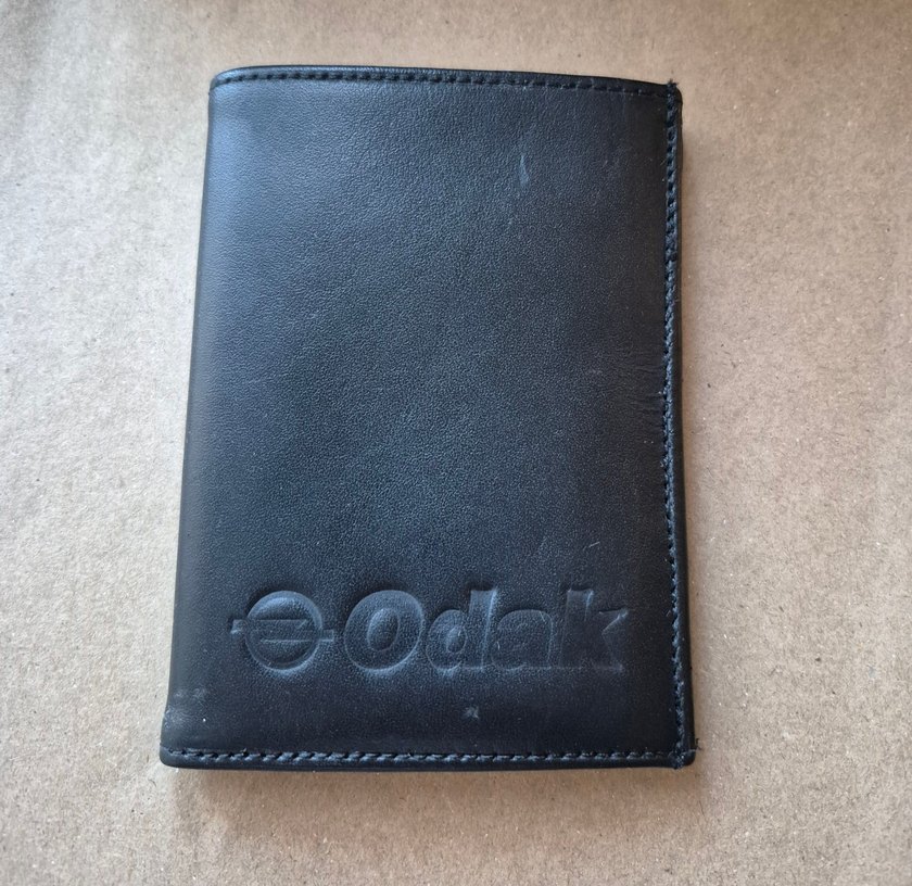 Yumuşak dokulu siyah erkek cüzdanı, üzerinde eOdalk baskısı bulunur, iş ve biker tarzına uygundur.