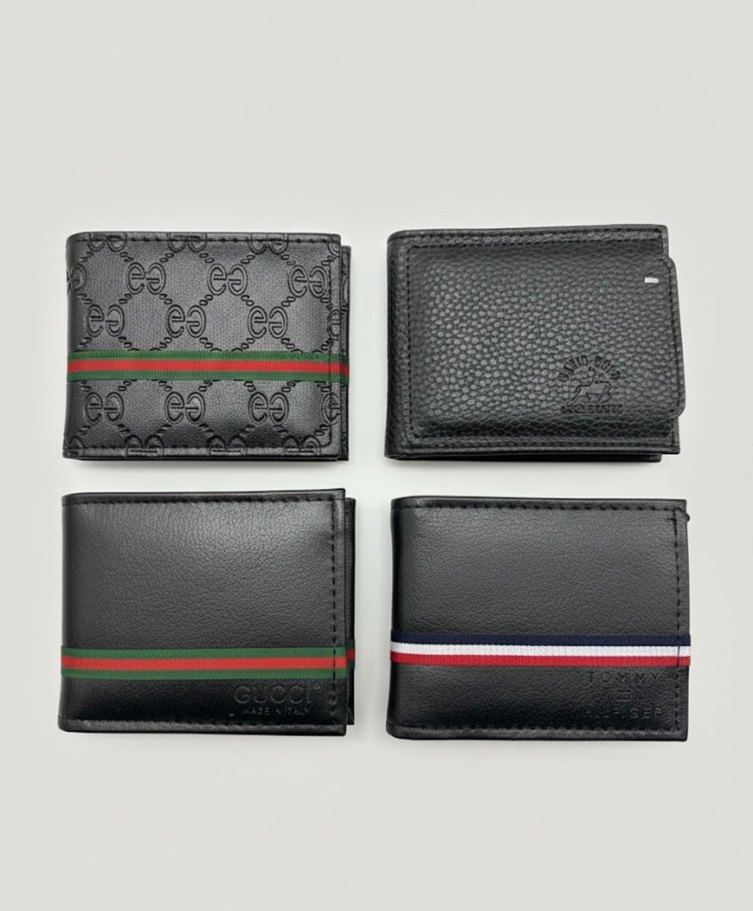 Nakışlı ve dokulu düz modeller içeren dört siyah erkek cüzdanı seti. Trendy casual ve iş stiline uygun, çizgili ve sade desenler içerir.