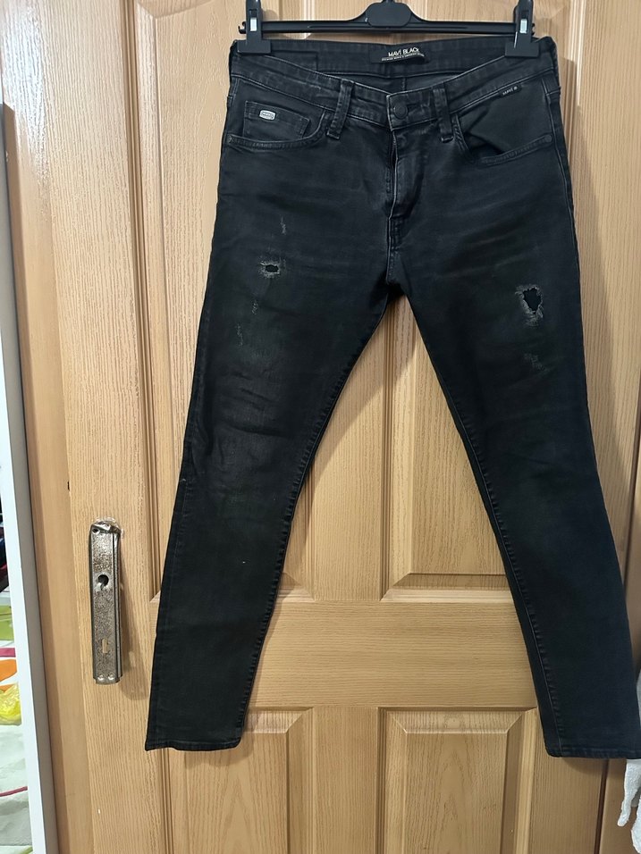 Düzenli kesim ve normal boyda siyah denim pantolon, hafif yıpranmış detaylı ve tokalı tasarıma sahip. Günlük kullanıma uygun.