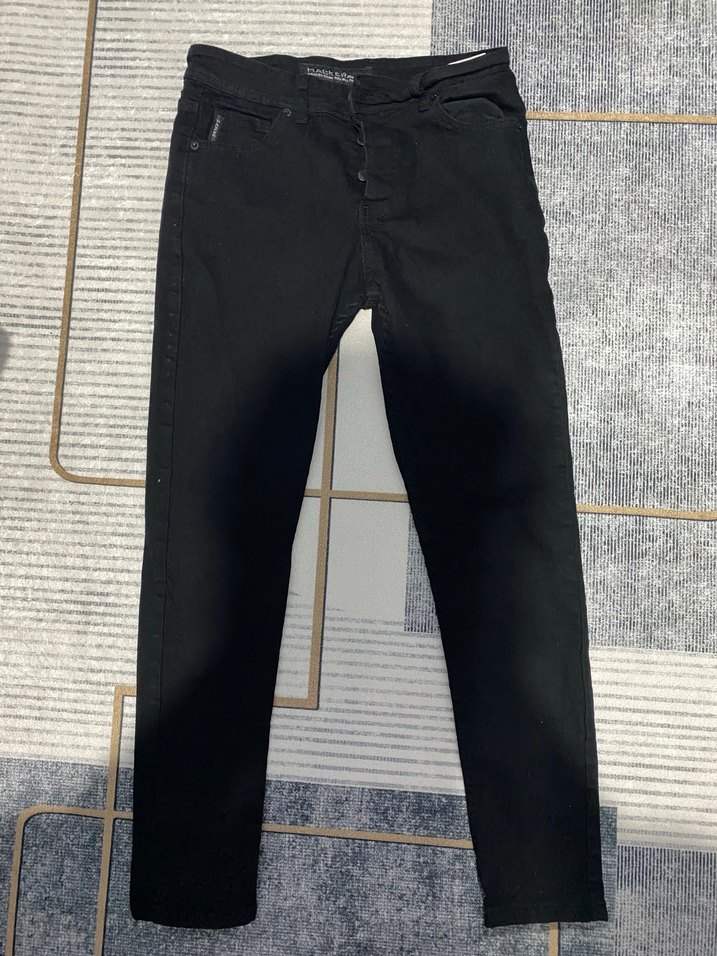Siyah renkte, düğmeli, desen içermeyen regular fit erkek denim pantolon, günlük kullanıma uygundur.