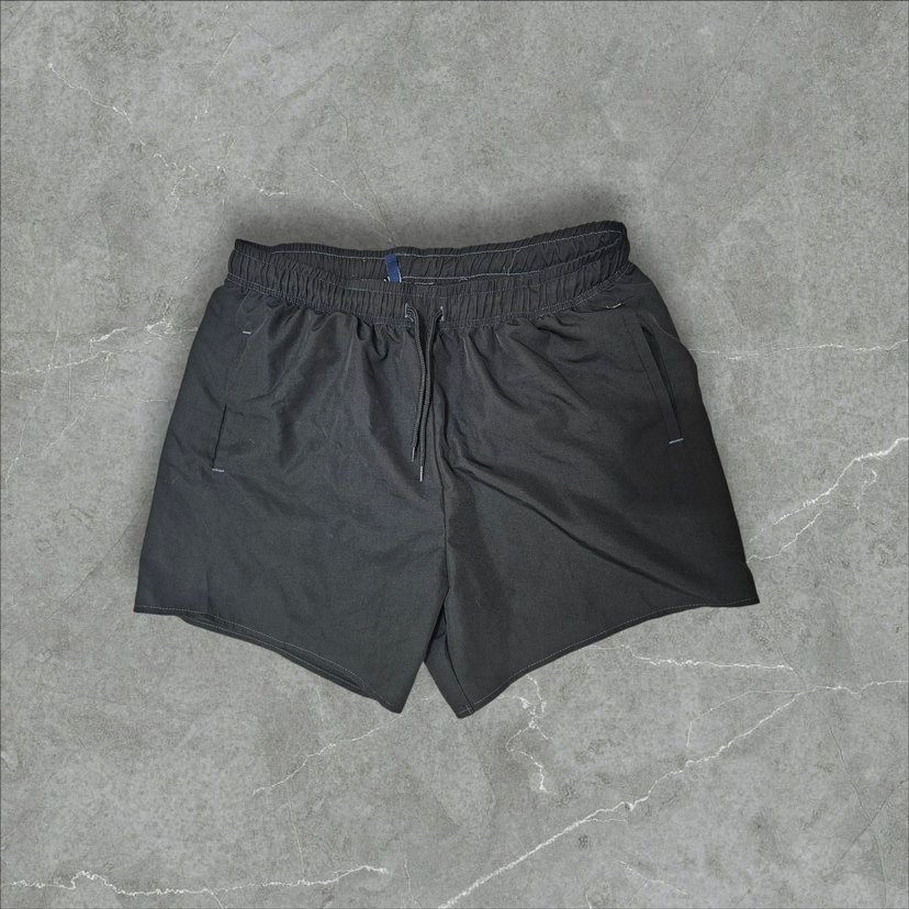 Siyah, elastik bel bantlı ve bağcıklı, rahat kesim erkek deniz şortu, sıfır hiç kullanılmamış.