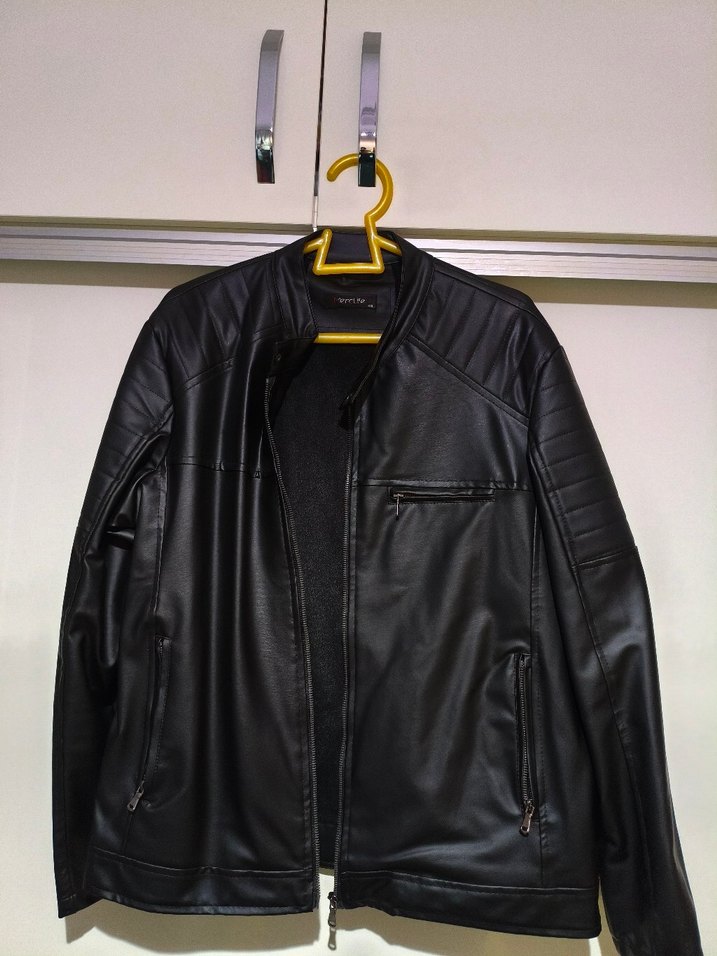 Siyah, fitted erkek deri biker ceket, yakasında kesik yaka., günlük kullanıma uygundur.