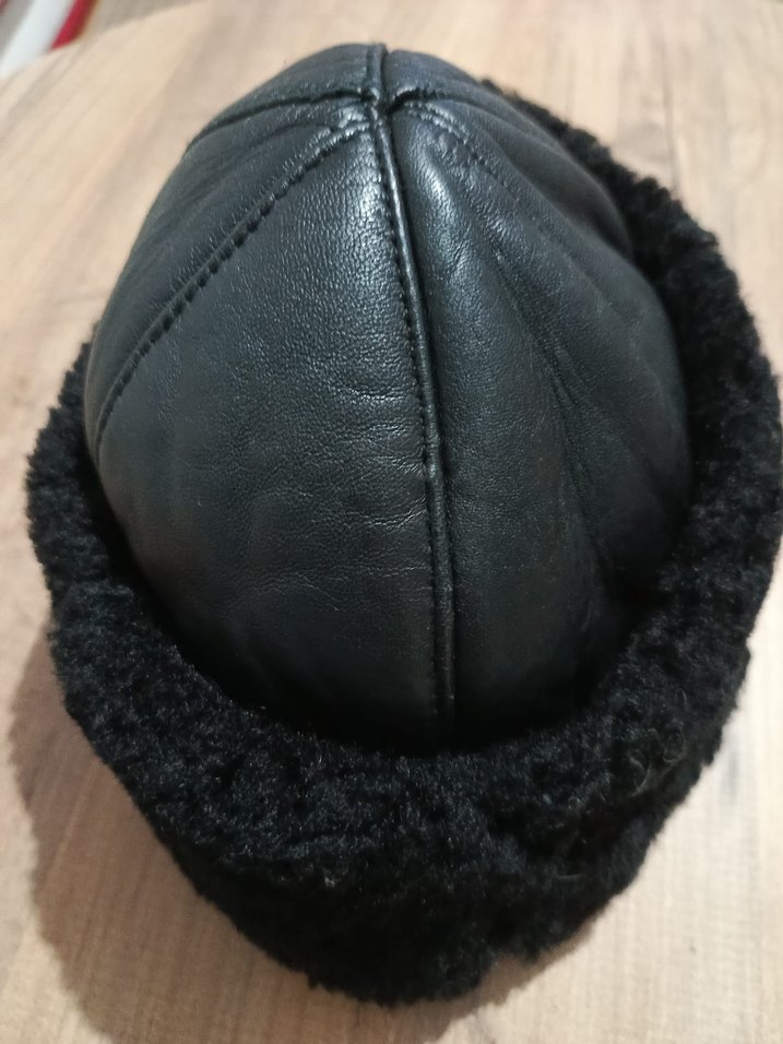 Erkek biker şapka, siyah deri üst yüzey ve yumuşak, sıcak siyah kürk detayına sahiptir.