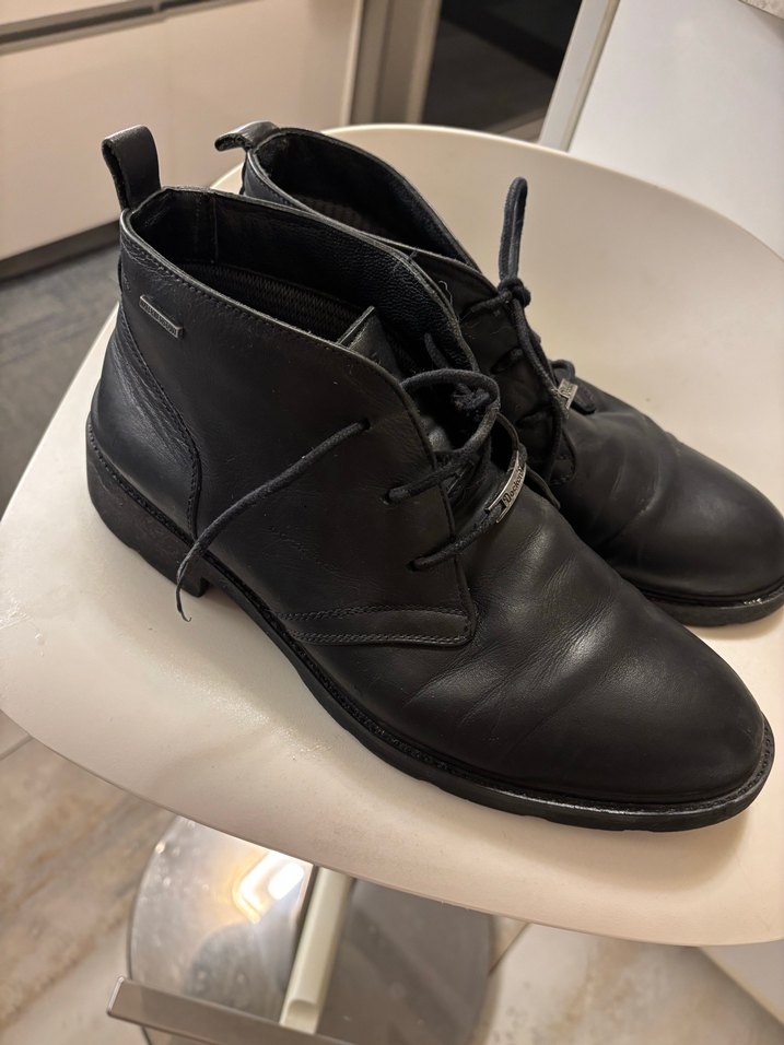Tokalı ve bağcıklı siyah erkek deri botları, goth iş tarzına uygun koyu renk ve desensiz tasarım. Arkada tutma kulpu bulunur. Dockers 41 numara görüldüğü gibi birinin üst boğaz kısmında minik bir açılma var kullanıma engel olmayan bu yüzden fiyatı uygun tutuyorum iade kabul etmem