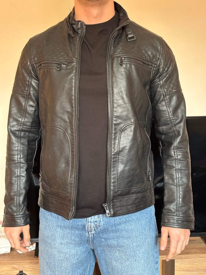 Deri ceket defacto m Kolunda ufak bir çizik var Giyen kişinin boyu 180 kilo 80dir.
