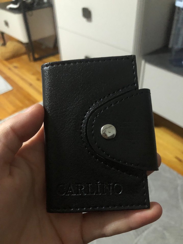 Siyah erkek deri cüzdan, çıtçıtlı kapak ve kabartma marka detayı ile klasik biker tarzını Paris havasıyla buluşturuyor.
