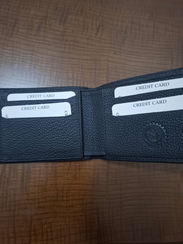 Bu siyah erkek cüzdan, baskılı desene ve kredi kartı için çoklu bölmelere sahiptir. İş için uygun çağdaş bir tarza sahiptir.