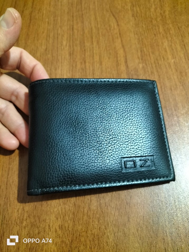 Kabartmalı deri dokusuna ve baskılı OZ logosuna sahip siyah erkek cüzdanı, çok iyi durumdadır