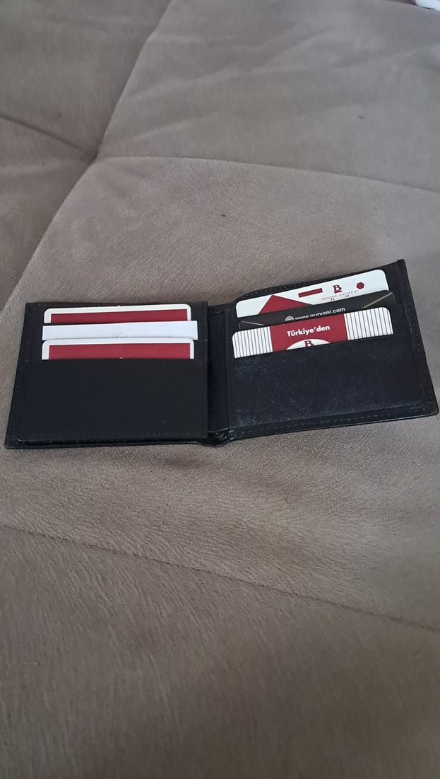 Siyah renkli, çoklu kart bölmeli, baskılı desenli erkek deri cüzdan. İş tarzına uygun sade ve koyu görünümlü.