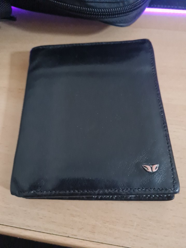 Düz siyah deri erkek cüzdan, küçük metal detaylı, desen içermeyen sade tasarım. Sadece Dikisleri beyaz yenilenmis ve kenarları yiprandı o kadar